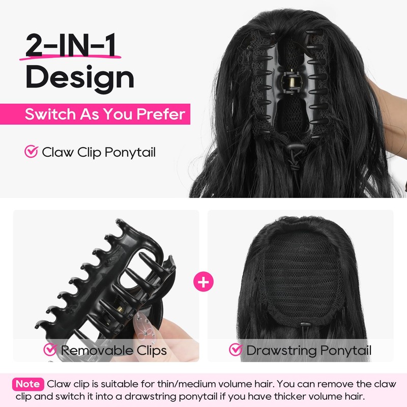 - 2 Ways to Wear: This is a 2-in-1 ponytail extension, which can be both a clip in ponytail and a drawstring ponytail. The clip in ponytail is more suited for thin and medium amounts of hair, and the drawstring ponytail can hold more thick hair. A versatile ponytail extension for women of all ages
