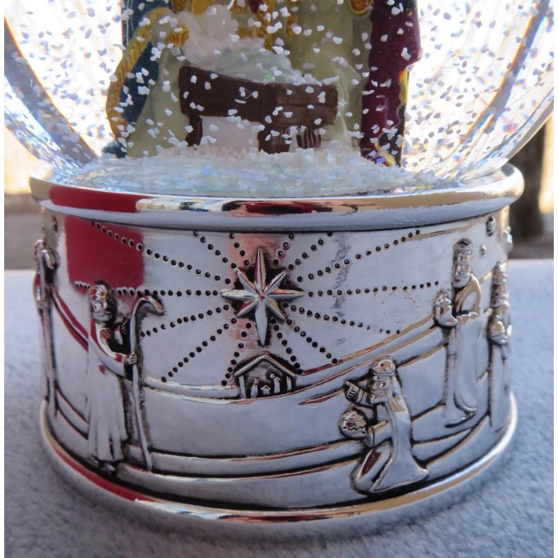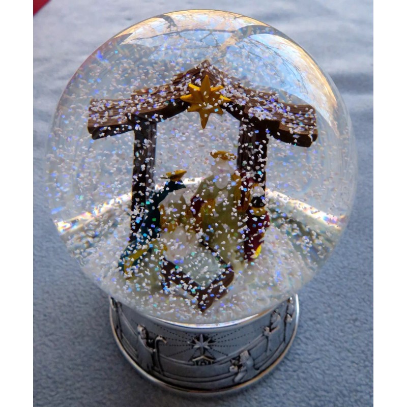 We are pleased to offer this beautiful, musical “Nativity” snow globe made by Reed and Barton. This snowglobe features a nativity scene in a manger. The tarnish-resistant silverplate base depicts the three wise men traveling with camels and shepherds traveling with sheep to follow a star shining over the manger. The bottom has the winding mechanism to make the globe play “O Little Town of Bethlehem.” It is in mint, unused condition in its original box. See our other listings for more Christmas collectibles. Buyer to pay shipping costs. If you have questions concerning shipping costs, payment options, item description, etc. please e-mail before bidding. Thanks for looking!