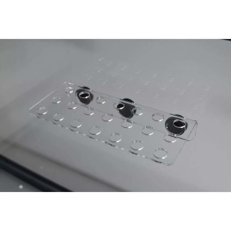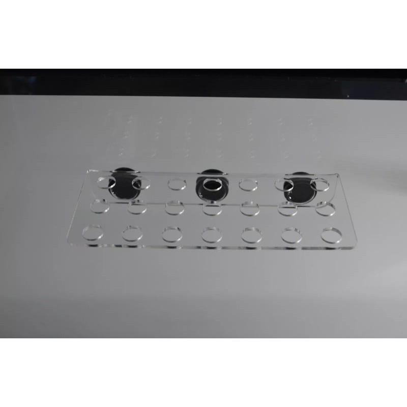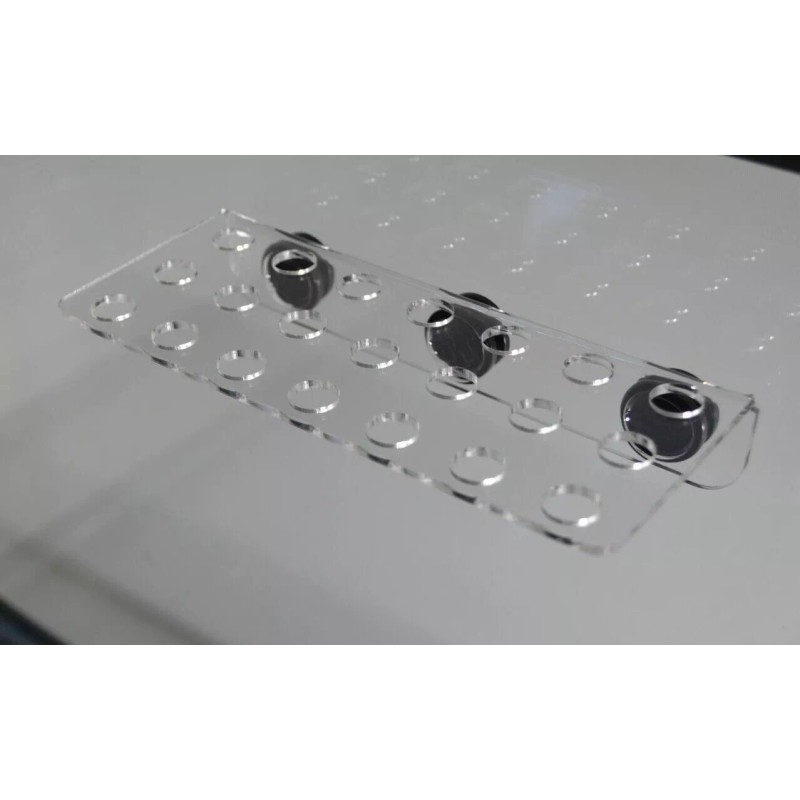 Our top of the line Frag Racks provide easy placement of coral fragments. Our product features convenient magnets. The clear acrylic used is 100% reef safe and will allow light to pass through, allowing you to use up all possible space in your tank. The precise, laser cut, the design allows the user to easily place corals into the rack as well as provide rigidity and stability during use. The platform was designed to withstand powerful water currents as not obscure lighting for the corals. Our product is guaranteed to exceed expectations and is designed with versatility in mind. The design can conform to many different settings without surrendering stability and strength. Holds up to: 21 frag plugs holes with 1/2" or smaller stems Dimensions: 7" x 3.25" This frag rack utilizes N52 magnets and is ensured to hold in tanks up to 1/2" inches thick. The inside magnet is encased in acrylic and guaranteed not to come in contact with water from the tank. Made 100% in the USA In stock ready to ship. - We would love to customize to your individual needs at an affordable price. - High quantity orders available at a great discounted price.- Need more than five ? please contact us, and we will be glad to work out a bulk order. |