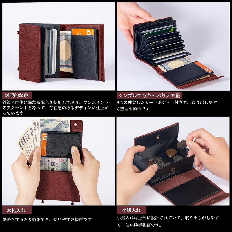 - Product Specifications: Length 4.1 inches (10.5 cm) x Width 3.1 inches (8 cm) x Thickness 1.2 inches (3 cm); Coin purse x 1; Card slots x 9; Bill x 1; Weight: Approx. 4.2 oz (120 g)