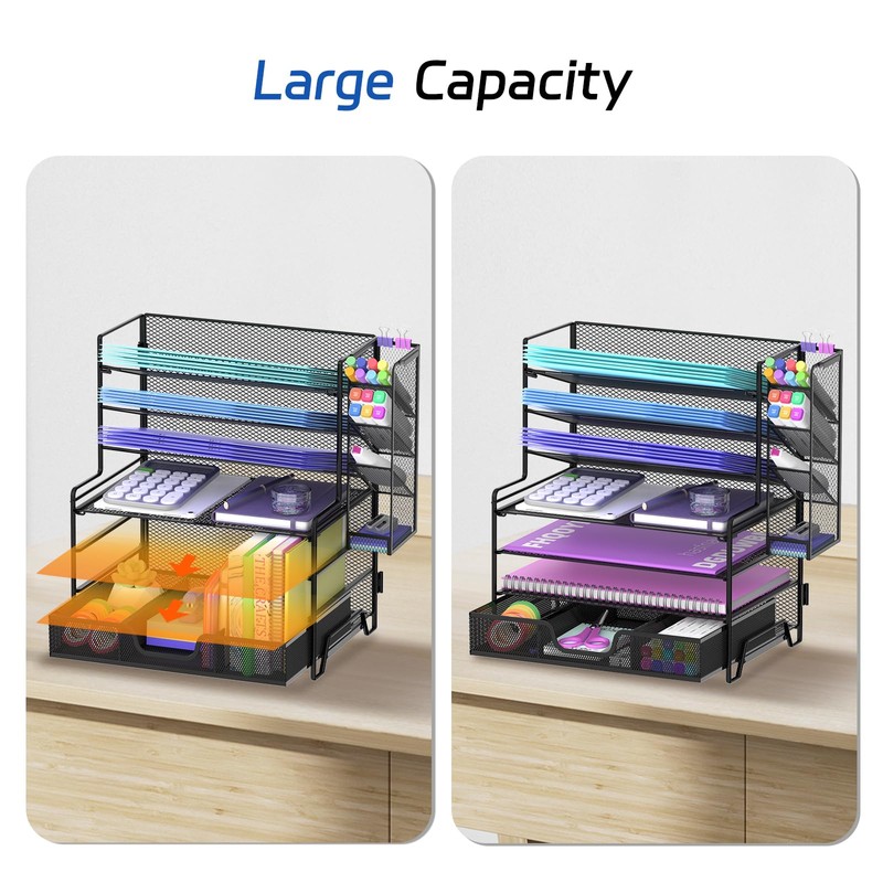 - Innovative Design: Our desk organizer features a groundbreaking tiered structure, combining 4 flat storage layers with 3 angled display tiers, ensuring all items remain visible at a glance to significantly reduce search time. The sloped multi-level design achieves optimal product presentation while guaranteeing effortless access.