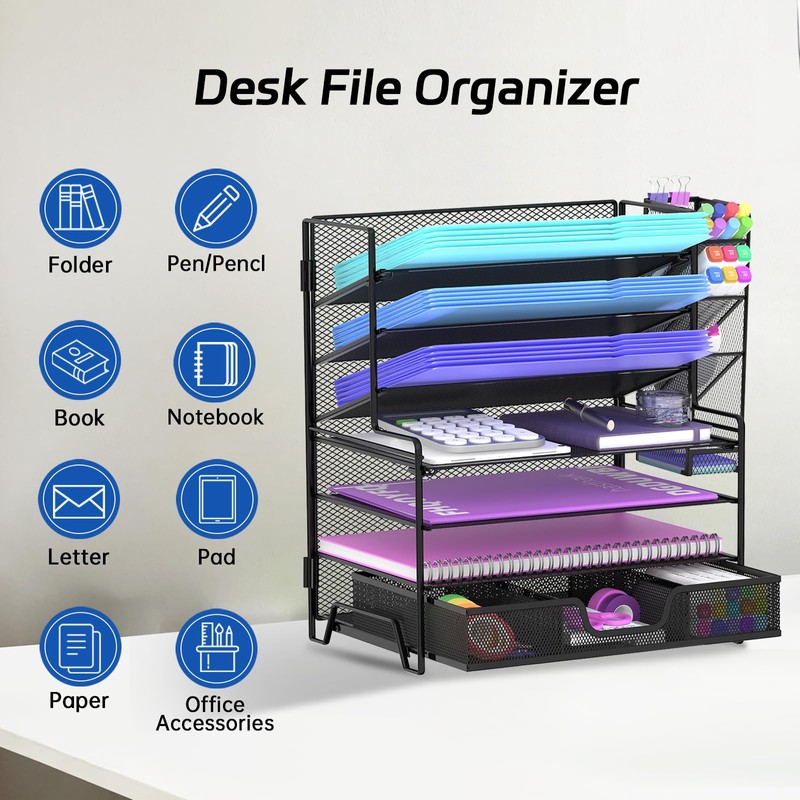 Reeplan 7 Tier Desk File Organizer, Letter Tray Paper Organizer with Pen Holder&Drawers for Office Home, Black