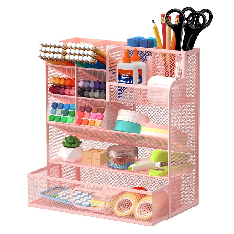 ReePlan Mesh Pen Organizer for Desk, Multi-Functional Wall Mount Pencil Holder with Drawer Desk Organizers and Storage for School Office Home Art Supplies(Pink)