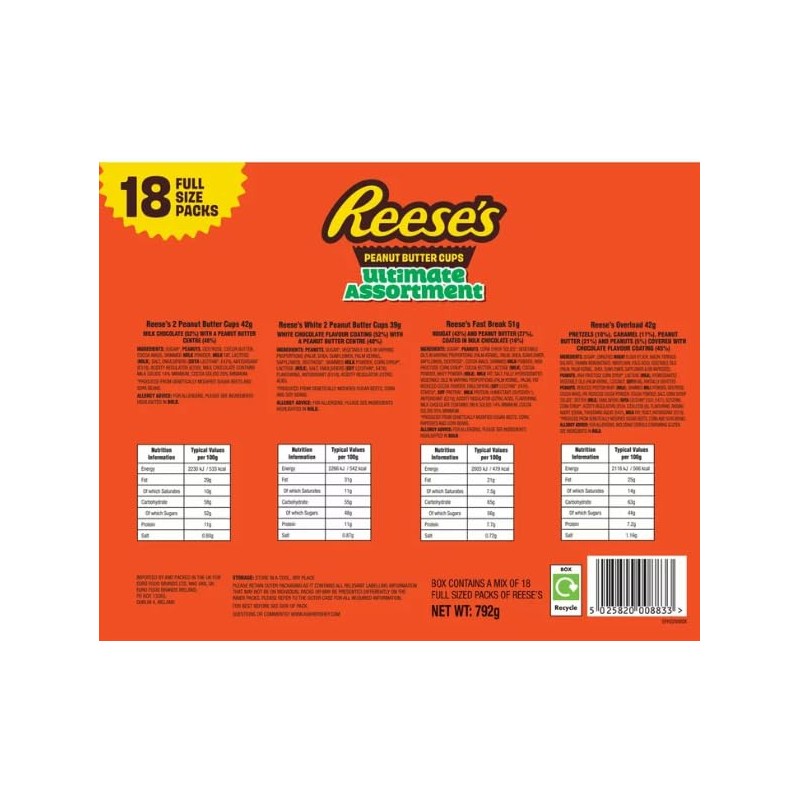Reese Peanut Butter Ultimate Assortment 18 Bars, 6 x Peanut Butter Cups, 3 x White, 4 x Overload, 5 x Fastbreak -792g, Perfect for Christmas