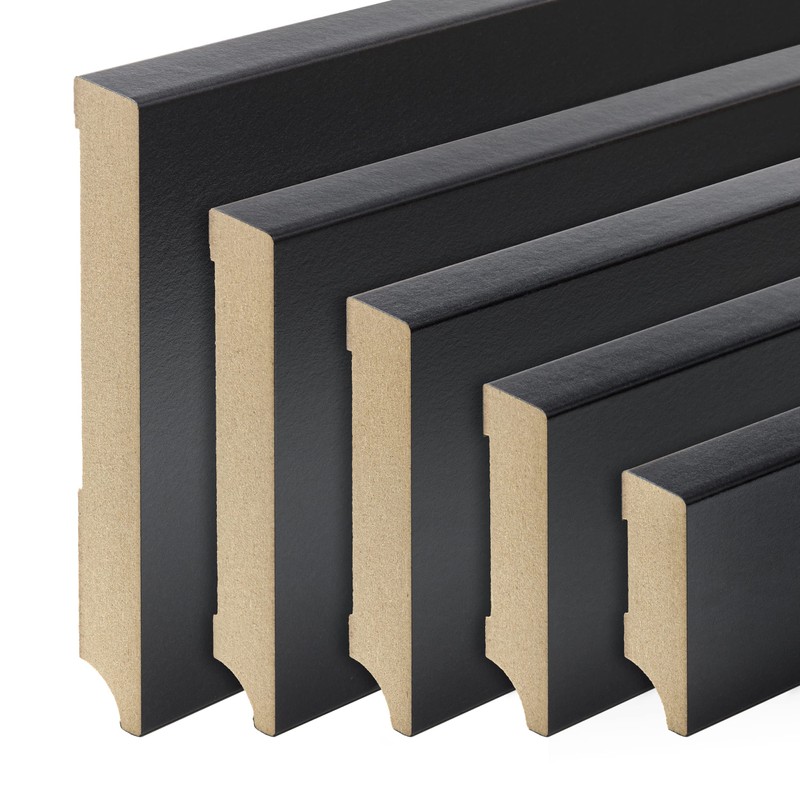 Black foiled skirting board in economy pack. Leipzig profile. 40 mm, 60 mm, 80 mm, 100 mm, 120 mm or 150 mm high. Pattern from €1.