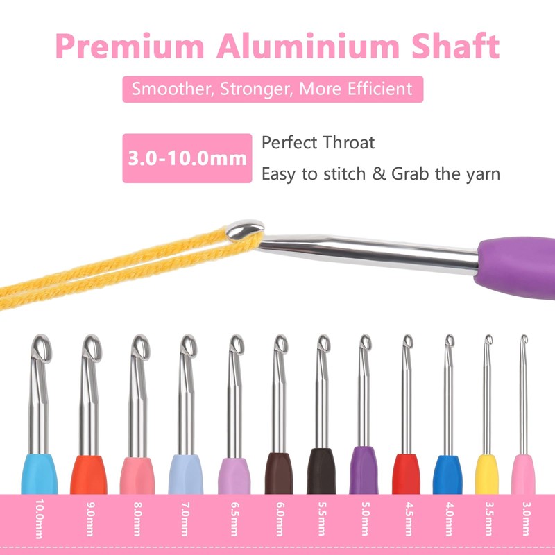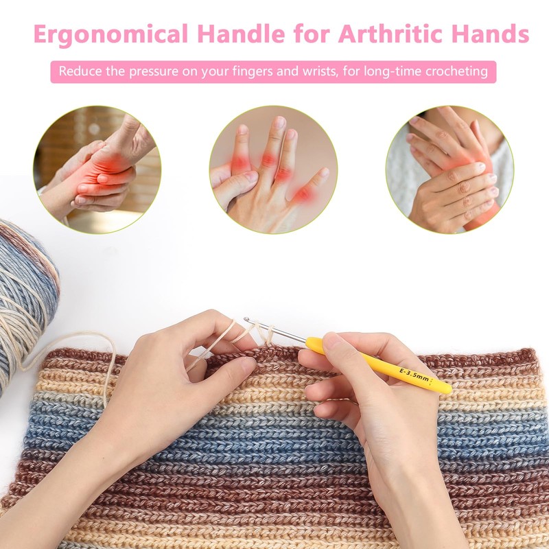 • [Ergonomic Crochet Hooks Design]: Our crochet hooks set ergonomic handle are made of soft silicone to reduce hand, wrist or finger pain, suitable for arthritic hands. Comfortable handholding makes you can crochet for a long time with less stress on your fingers and wrist. Perfect for crochet enthusiasts and crochet beginners.