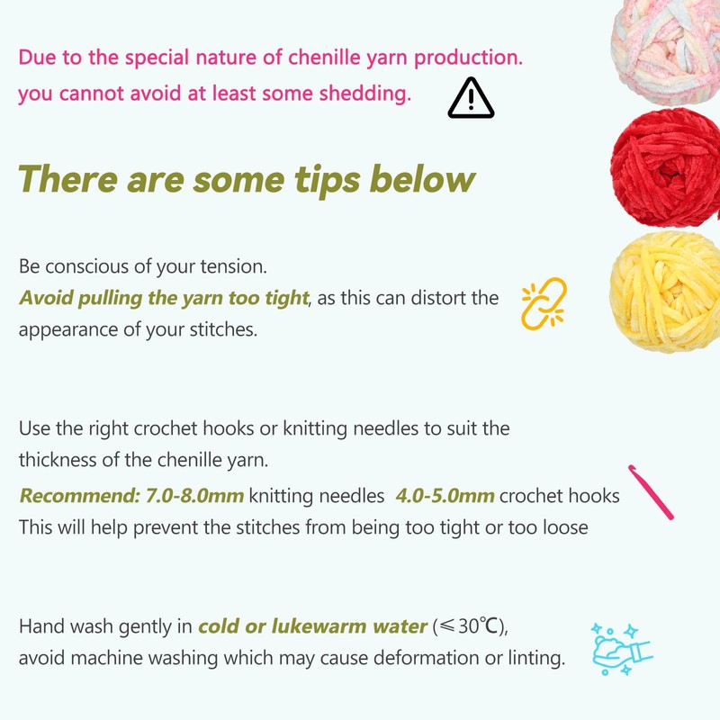 - [Easy care and durable]: This chenille wool is made of high quality polyester fibre which is easy to care for, less prone to fraying and won't shed threads every time you touch it, Ideal for apparel and home furnishings that need to be used over time. Do not bleach or iron. Please machine or hand wash in warm water and lay flat to dry.