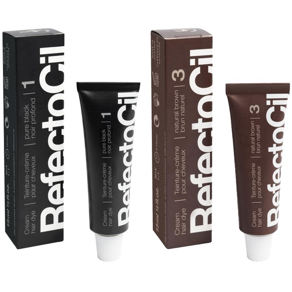 - 2-PACK. Includes 1x tube of RefectoCil No. 1 Pure Black + 1x tube of RefectoCil No. 3 Natural Brown cream hair dyes.