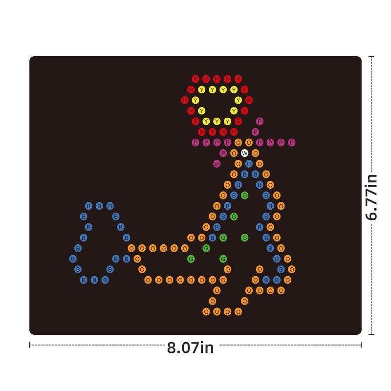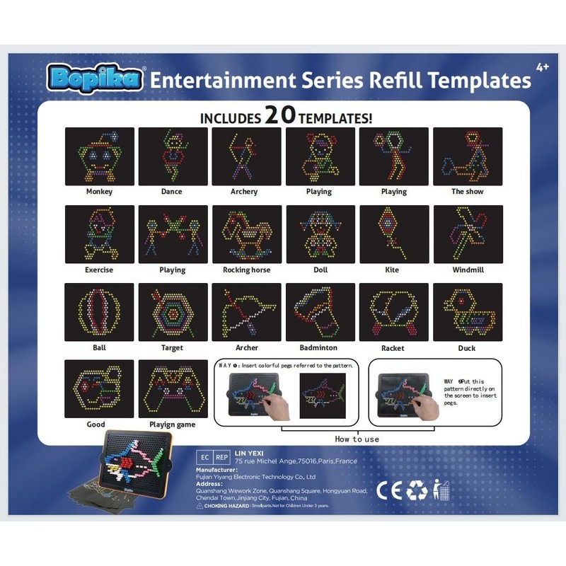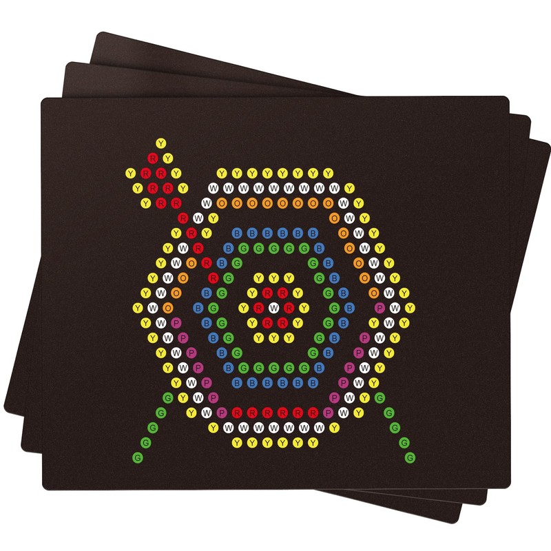 • The package Includes 20 design templates (size: 8” wide x 6. 8” high) : Templates are labeled with letters of the colored peg to be inserted in each hole.