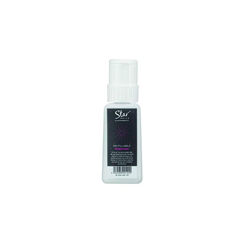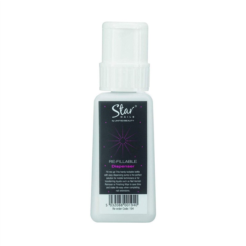 Refillable Plastic Liquid Dispenser This handy lockable bottle with easy dispensing pump is the perfect solution for mobile technicians or for transferring liquids such as Nail Varnish Remover or Finishing Wipe to save time and make life easy when completing nail extensions. 194 Refillable Plastic Dispenser