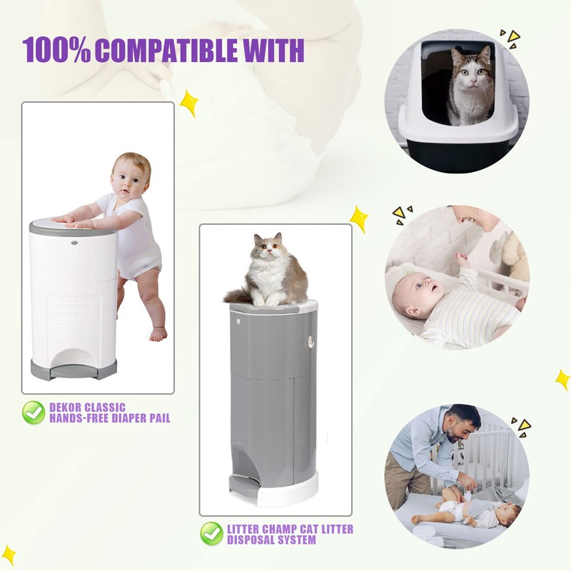 • Compatible with Dekor Classic Hands-Free Diaper Pail; Compatie with Litter Champ Premium Odor-Free Cat Litter Disposal System;DO NOT compatible with Dekor plus