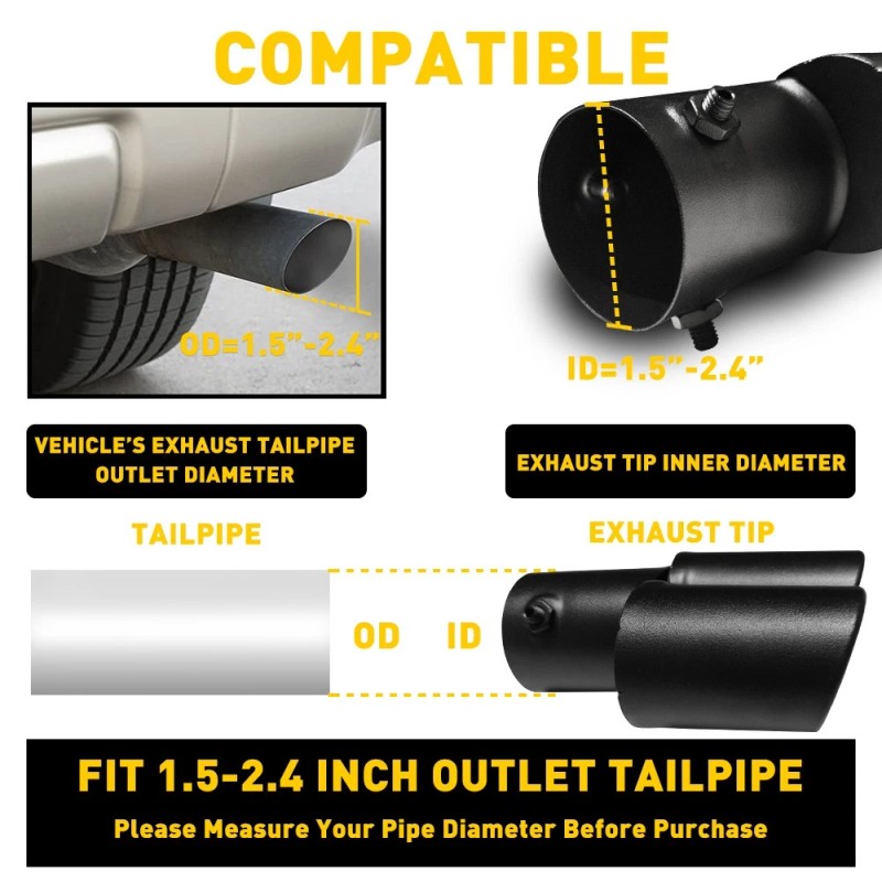 Please measure the outside diameter of your exhaust pipe before purchase, otherwise our product will not fit your car. This tips fit only 1.5 - 2.4 inch outlet tailpipe