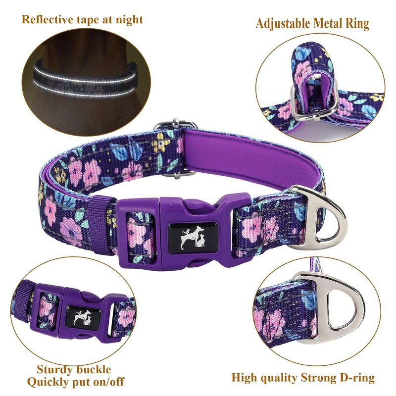 Reflective Dog Collar for Medium, Large & Extra Large Dogs - Purple Floral Design High Visibility Night Safety Collar, Soft Neoprene Padded,Durable & Adjustable for Night Walks -XL