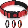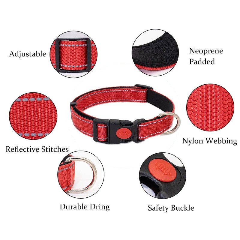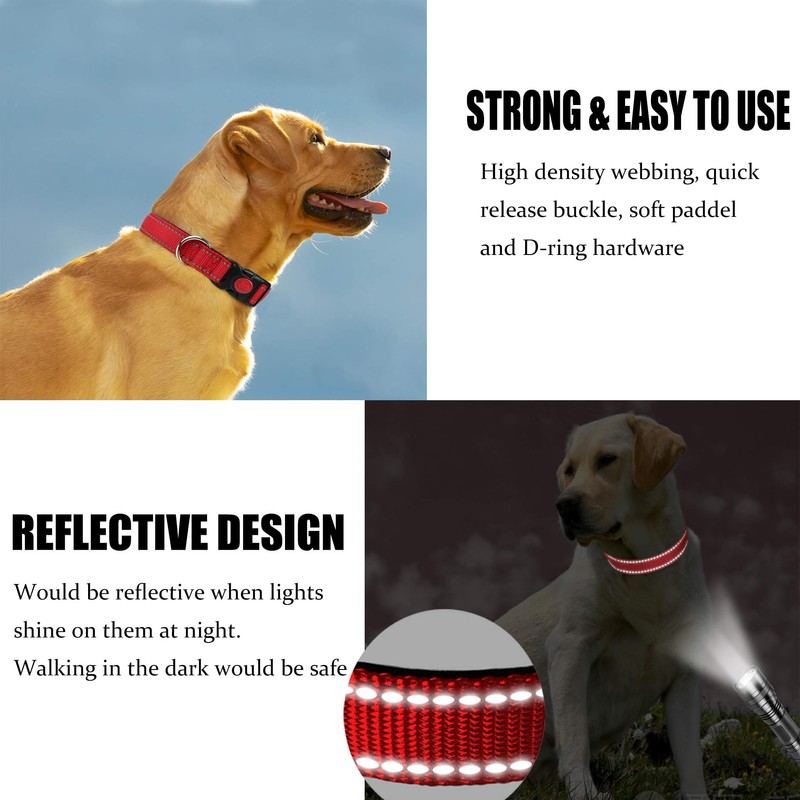 - 【Premium Material】Our reflective dog collar is made of high density nylon, comfortable, pliable, lightweight and elegant. Nylon webbing joints are all treated with sewing to protect your dogs and hands are not easy to scratch during use.