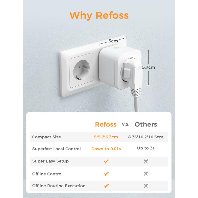 • Power meter for socket: The Refoss intelligent socket allows real-time monitoring of the power consumption of your household appliances. With the Refoss app, you have a clear overview of daily, weekly, monthly and annual consumption. (By entering the cost factor per kilowatt hour, the total amount of the electricity bill can be calculated.) In addition, the socket can also monitor the energy generation of your balcony power plant.