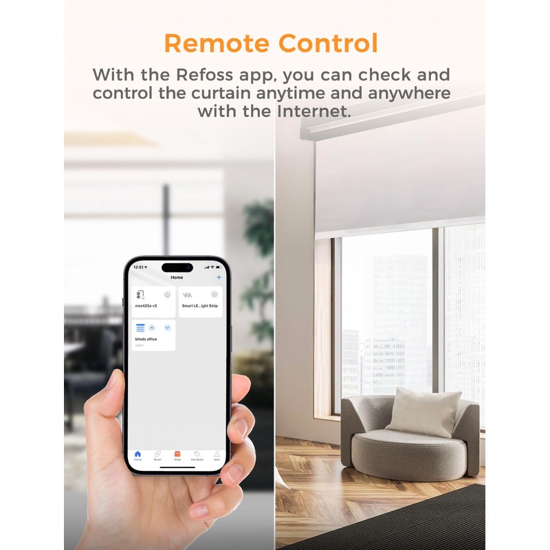 • Remote control and schedule: with the free Refoss app, you can control your curtains anytime and anywhere by remote control, regardless of your location. The timer function of the intelligent roller shutter switch WiFi allows you to open or close the curtains at predefined times, giving you an energy-saving and convenient experience. You can also try the sunrise and sunset modes.