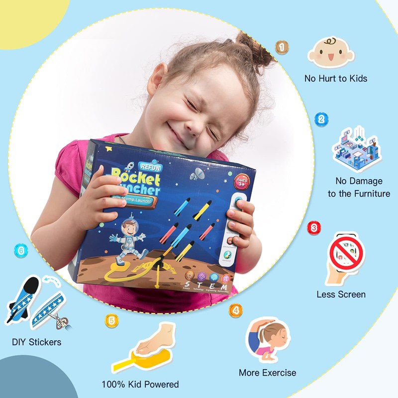 - 【Learn STEM Through Play, Ideal Gift for Kids】REFUN Rocket launcher can satisfy kid' s curiosity about space exploration, get kids interested in STEM subjects, gain better scientific knowledge, such as gravity, ballistics and wind effects.It also provide the DIY stickers for kids to decorate the rockets, improve their creativity and hands-on ability. So it is a perfect present for boys and girls for birthdays, Christmas and any holidays.Issue with your order? Please feel free to contact us.