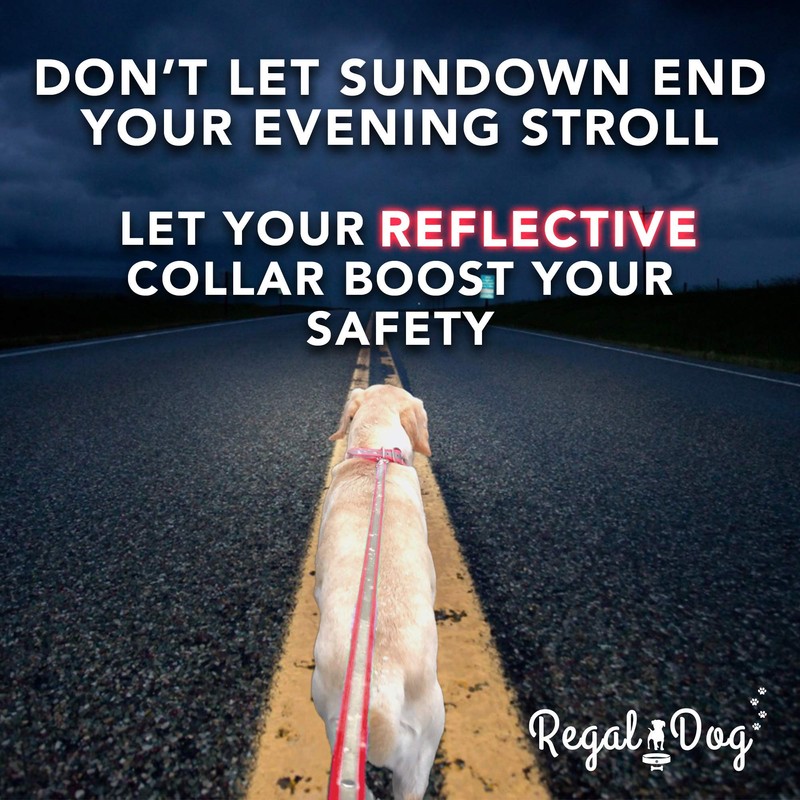 - SAFETY UNDER SUNDOWN - Walking your dog in the dark is dangerous. Fetch some safety for both you and your furry friend with the Black Reflective Dog Collar by Regal Dog Products! As cars pass, the highly reflective strip notifies drivers of your presence so they can safely steer clear. Keep your dog visible and out of harm's way wherever you may go day or night. With the customizable name plate, you can keep your furry friend safe and properly idenfied.