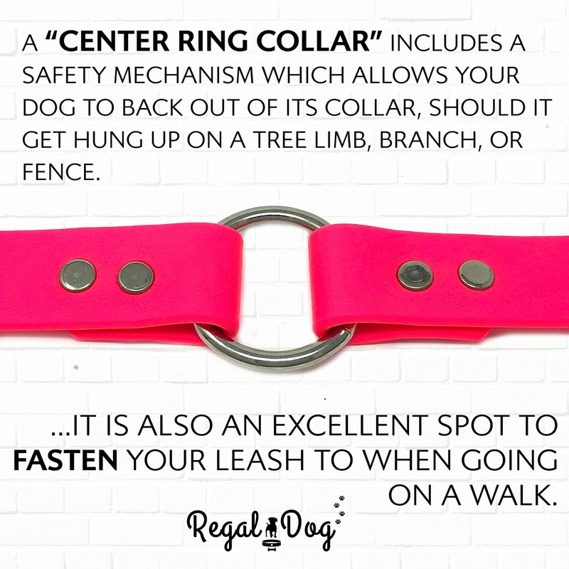 - ADJUSTABLE / CUSTOMIZABLE FIT: This biothane dog collar fits small, medium, large, and big dogs. It can be used for neck sizes ranging from 10.5 inches to 23 inches (see sizing chart) which will fit a puppy dog to an extra large dog. This water-resistant dog collar has a width of 3/4” inch (small size) size and 1" inch wide (medium and large sizes). Metal center safety ring relieves pressure when caught on an obstacle and is also a handy place to attach a leash or lead when training your dog.