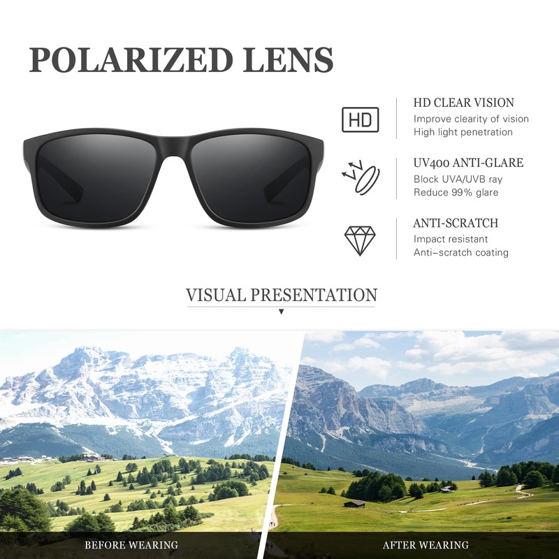 To protect your eyes from the harm of UV rays, Reglaaly mens polarized sunglasses are made of high quality polarized lenses with UV400 protective function. The HD polarized lenses can block over 99.9% of harmful UV rays and reduce glare and reflections of strong light, giving you a clear visual experience for outdoor activity