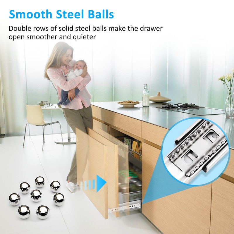 - 【Double anti-rust】 The whole slides is made of High quality stainless steel,it’s anti-rust capability have been improved more than 2 times compared with the ordinary ones. It’s suitable for bathroom cabinets,wardrobes,document cabinets, civil furniture, office furniture, etc.