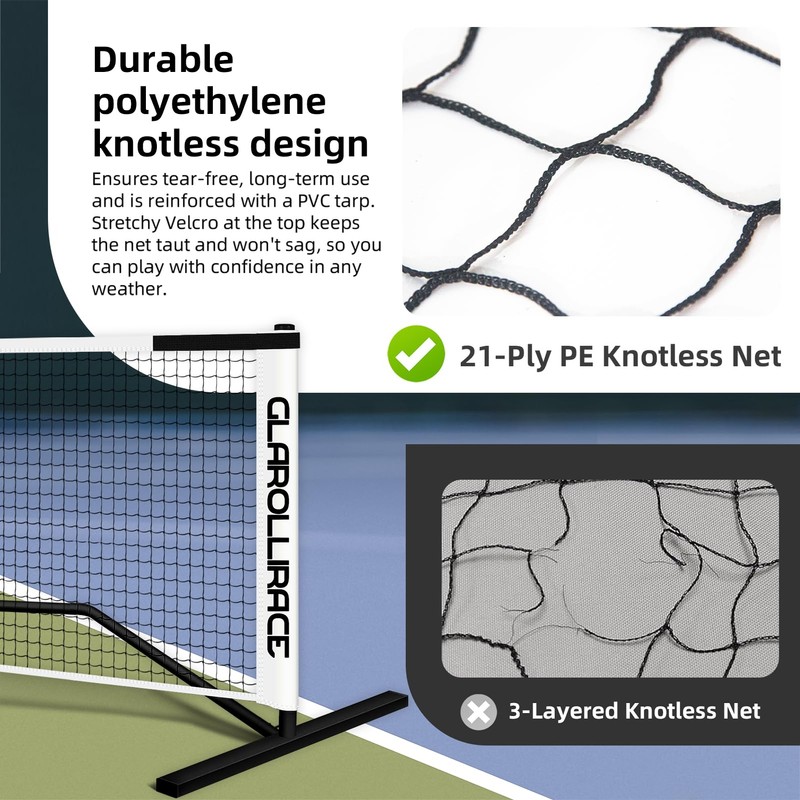 - 【Durable 22 FT PE net】Full size 22 FT PE pickleball net, 36 inches high on both side, 34 inches high in the middle.It is regulation size for USAPA pickleball tournament and training.PE net is extremely durable and sturdy, you can use it for several years and not easily split.