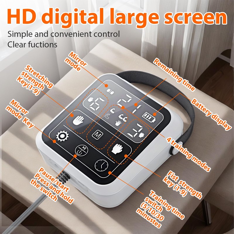 • 【Portable & Easy To Use】The finger rehabilitation gloves are designed with a high definition LCD touch screen with English instructions for effective operation and use by patients. The Robotic Hand Trainer is small and lightweight, whether indoor or outdoor, you can train anytime and anywhere.
