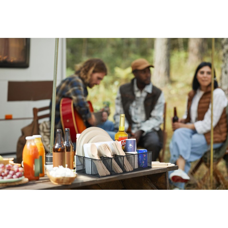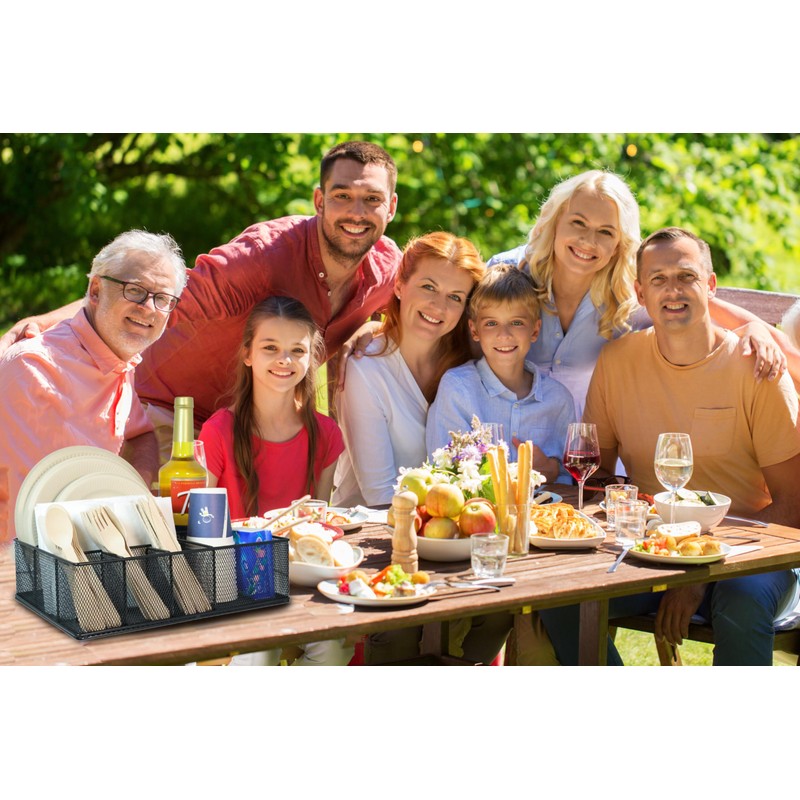 - PERFECT FOR CAMPING & PICNIC- This silverware caddy picnic organizer saves space by neatly holding paper plates, silverware, cups, and napkins. Everything is organized and within easy reach. It's a tidy and efficient solution for indoor/outdoor dinners, events, weddings, office parties, and holiday gatherings. With its versatility, it's also the top choice for camping, barbecues, and outdoor gatherings, portable and ensuring clean and hygienic utensils for every organized and stress-free gathering