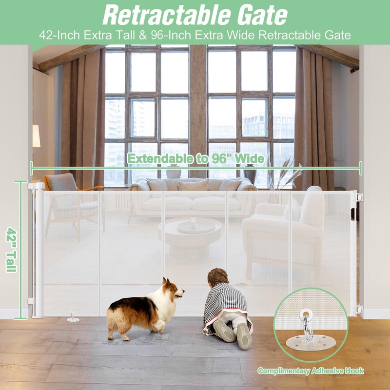 - Extra Tall Extra Wide Pet Gate - This retractable gate stands 42 inches tall and extends up to 96 inches wide, fitting most openings and easily adjusting to your desired width. The extra height effectively prevents pets from climbing or jumping over.