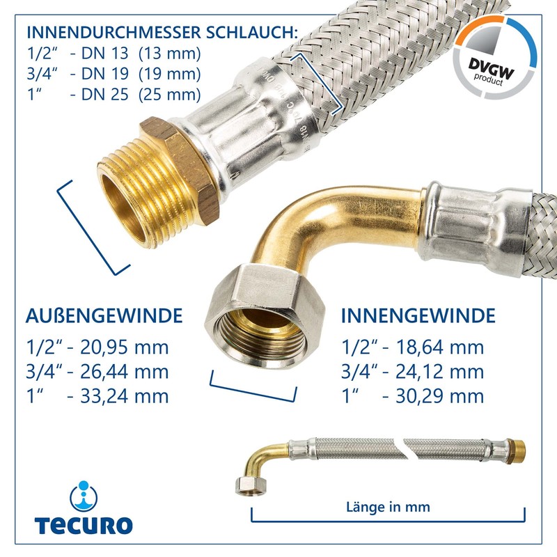 - Flexible connection hose with inner hose HDPE, braided stainless steel 1.4301, connections brass (nickel-plated outside), manufactured and tested according to KTW-A, W 270 DVGW