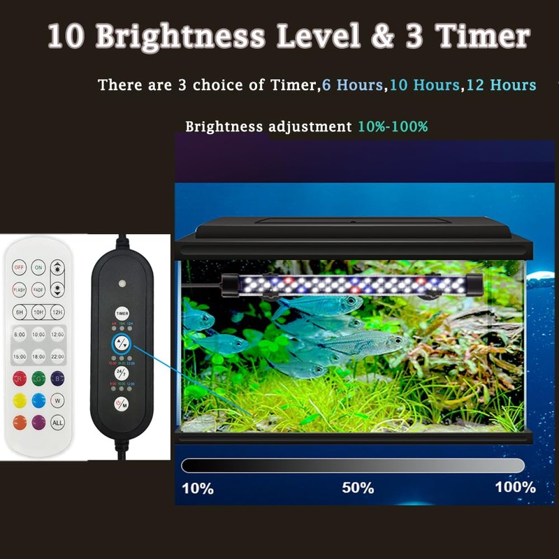- [Simulating 24/7 Natural Light Cycle&Timing Setting]24/7 Cycle Mode Fish Tank Light]Full Spectrum Fish Tank Light with Timer Can Auto On/Off,and our aquarium light with controller has lighting modes that simulate sunrise to sunset,adjustable brightness,color changing modes,timing functions(6 hours,10 hours and 12 hours).Note that the fish light needs to be connected to an air pump of sufficient power to produce bubbles (the air pump is purchased separately)