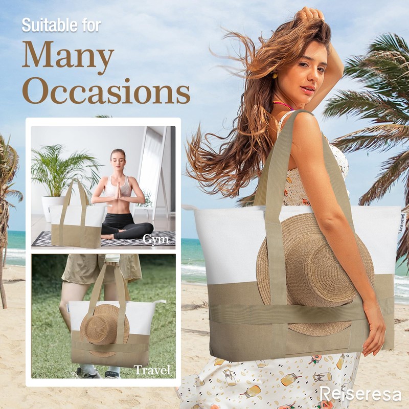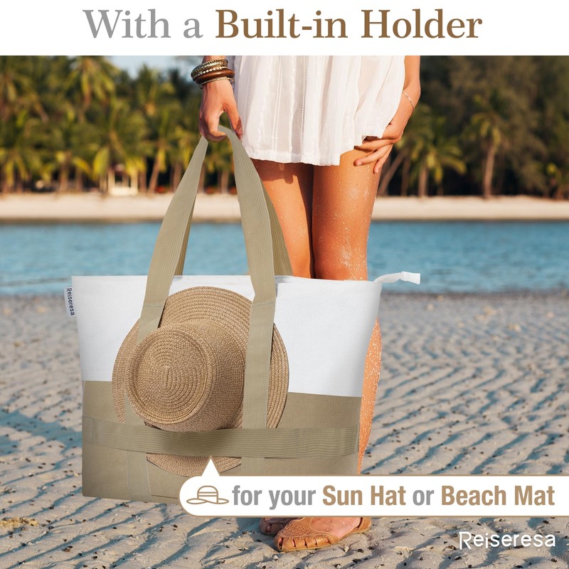 Reiseresa Beach Bag with Hat Holder Strap, Large Beach Bag with Zipper, Beach Tote Bag for Women, Canvas Khaki