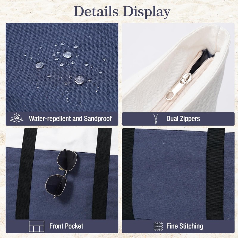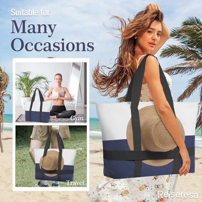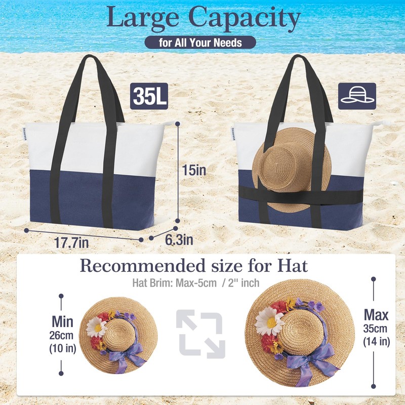 Reiseresa Beach Bag with Zipper, Beach Tote Bag for Women, Large Beach Bag with Hat Holder Strap, Canvas Blue