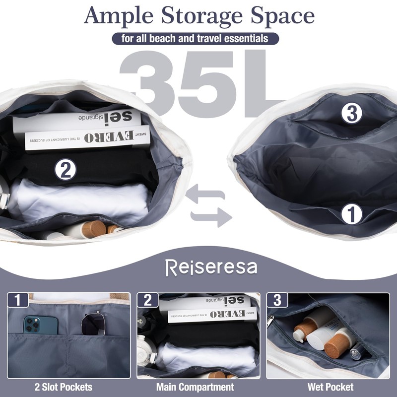 - Huge Capacity with Zippered Closure: Measuring 15 x 6.3 x 17.7 inches, this 35L beach bag offers ample space for all your family's beach essentials. The zippered design ensures that your belongings stay secure and dry.