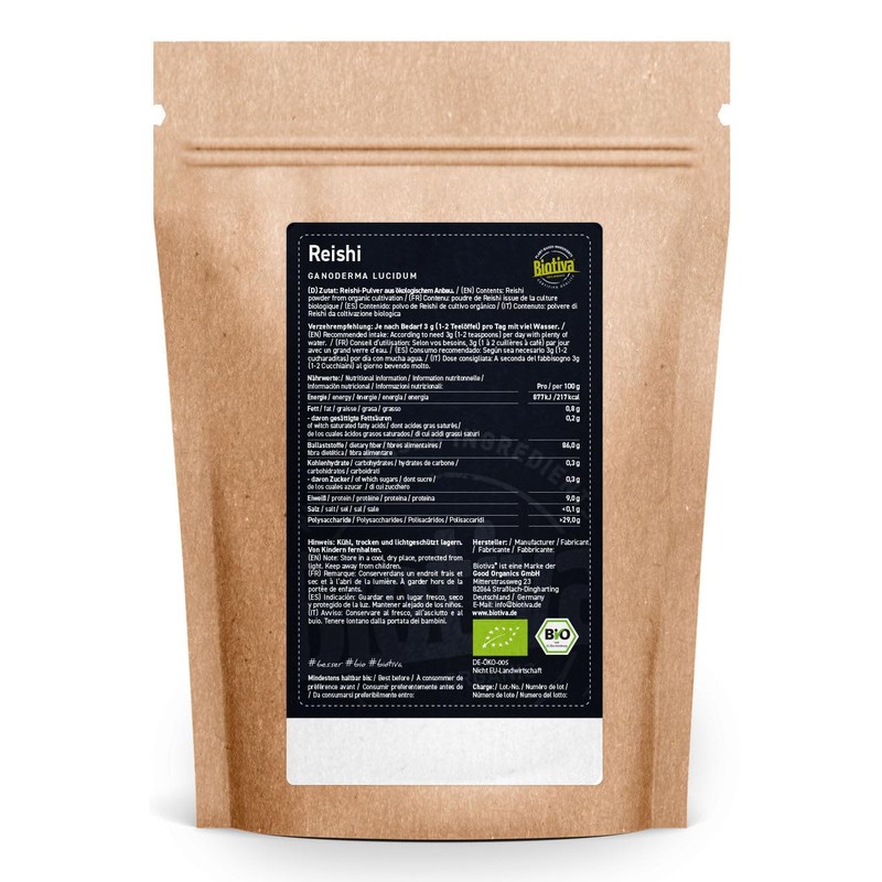 Reishi Powder Organic 250 g (2 x 125 g) - Ganoderma Lucidum - Shiny Lacquer Porling - Travel Powder - Mushroom of Immortality - No Additives - Vegan - Bottled in Germany - Biotiva