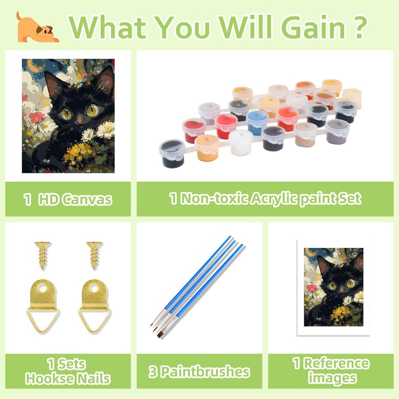 The kit includes 1 waterproof canvas, 1 instruction sheet and line drawing, 1 set of acrylic paints, 3 paintbrushes, 1 set of hooks. The canvas is marked with numbers that correspond to the colors of paint that should be applied in those areas, making the painting process straightforward and convenient.