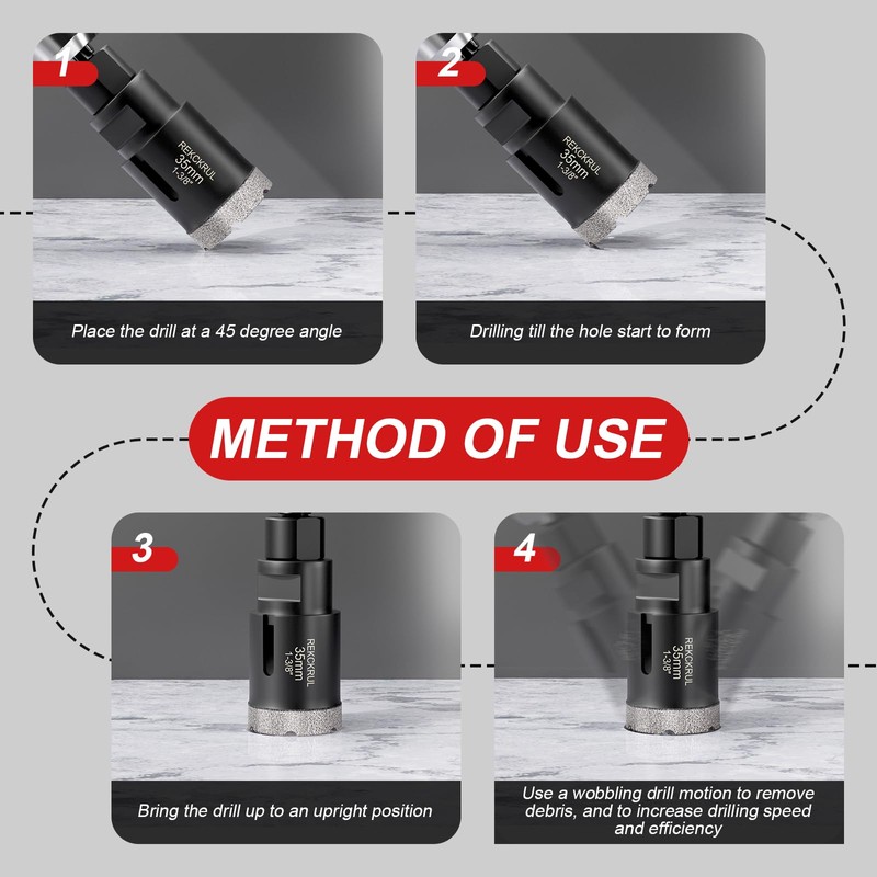 • User-Friendly Performance – Slotted barrel design enhances cooling and debris removal. Start at a 45° angle for precise positioning, then drill upright effortlessly
