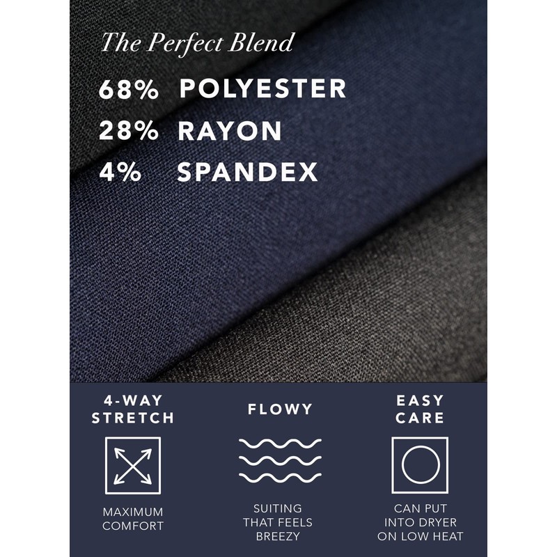 - YEAR-ROUND, ALL-SEASON FABRIC: Refined Stretch Suiting Fabric: 4-way stretch, tropical weight fabric. 68% Polyester 28% Rayon 4% Spandex (Content may vary slightly depending on color)