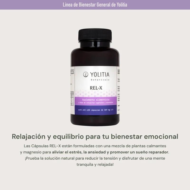 Rel-x es un suplemento natural formulado para ayudarte a reducir el estrés diario, calmar la mente y conciliar un sueño reparador sin causar somnolencia residual ni dependencia. Su fórmula contiene una cuidadosa mezcla de extractos herbales, adaptógenos y nutrientes naturales que trabajan en conjunto para equilibrar el sistema nervioso y promover la calma emocional.