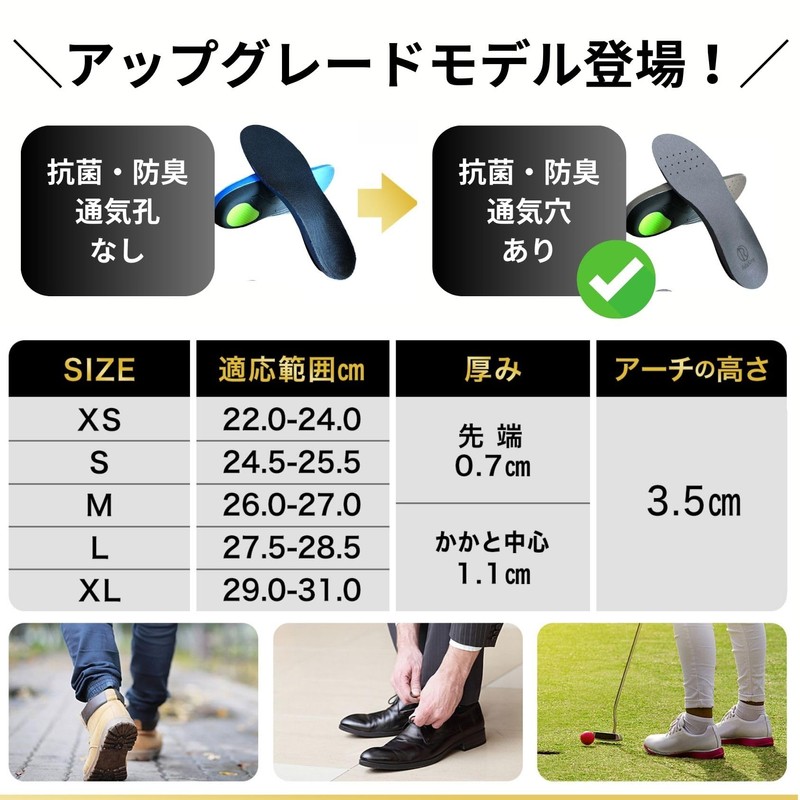 (Improved breathability and odor resistant performance to prevent foot odors) The surface material has been treated to be deodorized. In addition to the mesh material, the front has ventilation holes for increased breathability. Although it does not fit tight shoes, it can be used with a variety of shoes, such as sneakers, business shoes, safety shoes, golf shoes, etc.