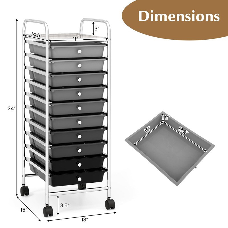 - 【Built to Endure for Long-lasting Company】The 10-drawer rolling cart boasts a heavy-duty metal frame that is not only sturdy and rustproof, but also provides remarkable stability. With its large capacity and long lifespan, this cart is designed to withstand heavy items. The PP drawers, featuring smooth knobs, are both convenient and highly durable.