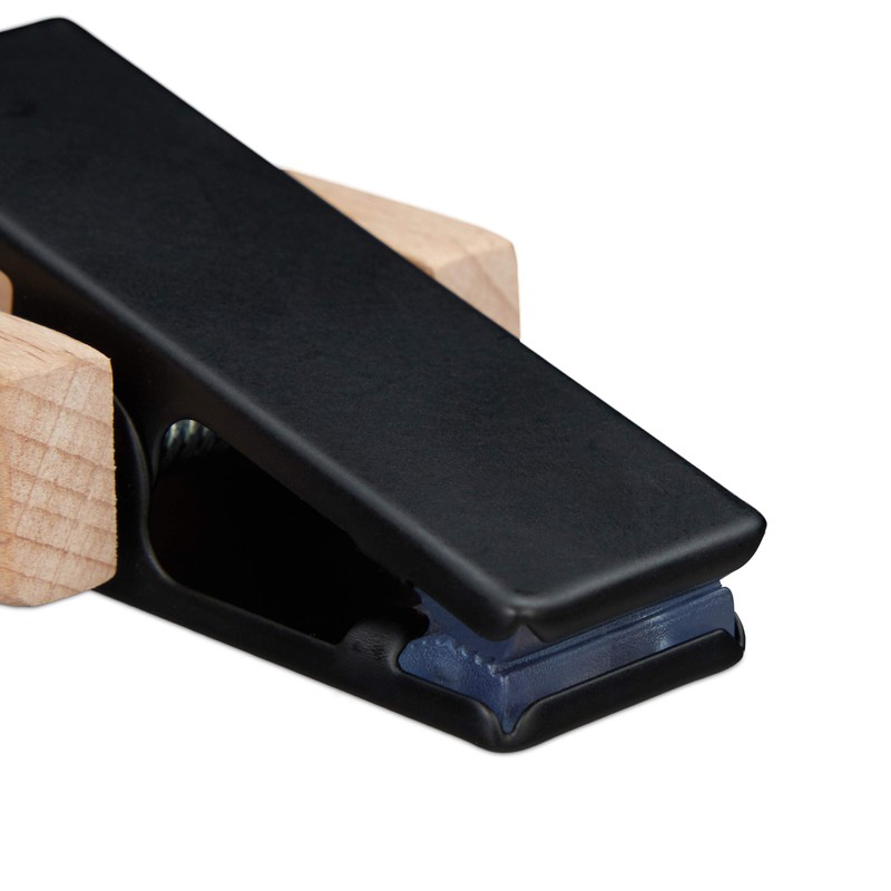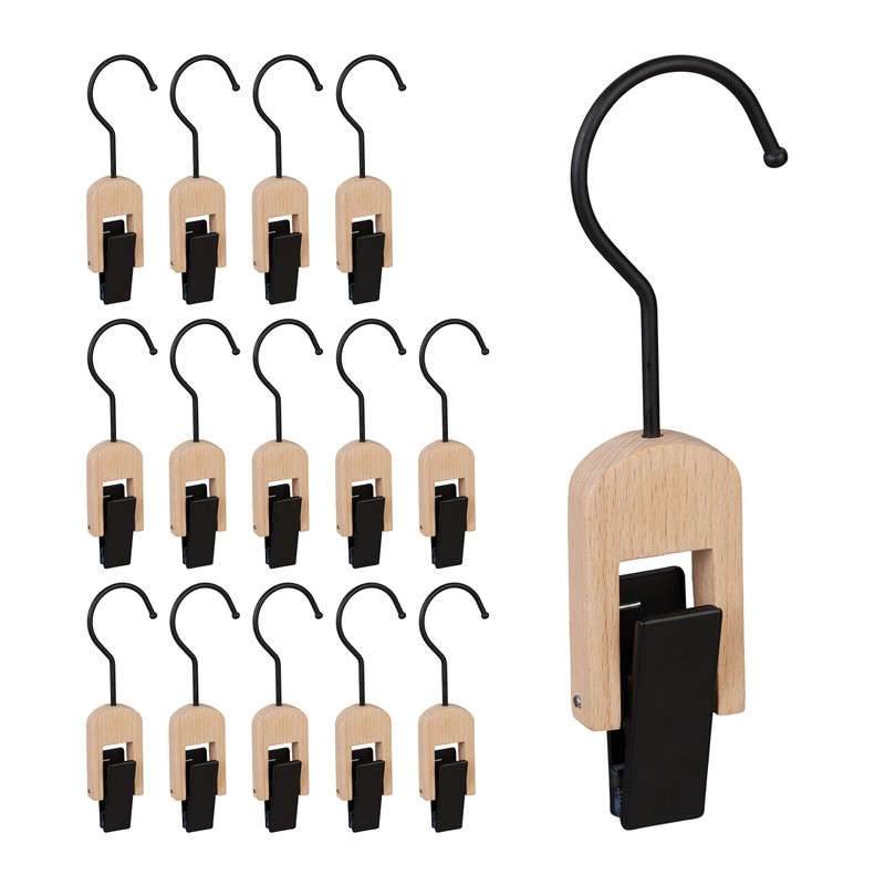 Relaxdays Set of 10 Rubberised Clothes Clips with Hooks for Cloths, Hats, Peg Hooks Set Made of Wood and Iron, Black / Natural