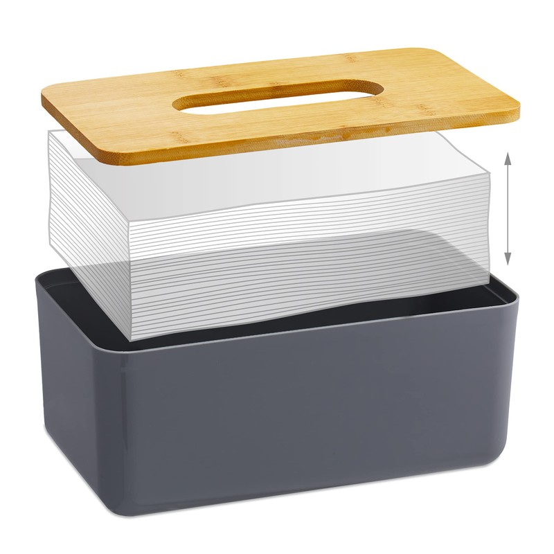 Relaxdays Tissue Box, Refillable, Bathroom, Napkin Dispenser, Bamboo Lid, Plastic, 10 x 23 x 13 cm, Grey/Natural
