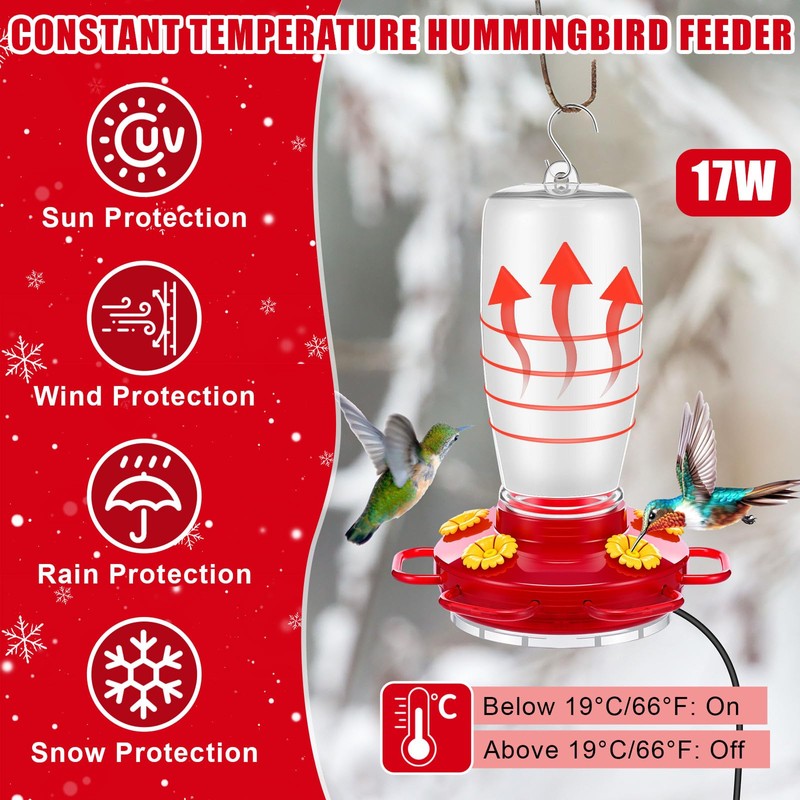 - Constant Temperature Feeder: the heated hummingbird feeder is made of plastic, which can resist sunlight, rain and snow, keeping the hummingbird food fresh; This hummingbird feeder has a built-in 17W heating plate, just connect the hummingbird feeder to a power source, and the heater will heat the liquid in the hummingbird feeder to 19℃/66℉; When the temperature drops below 19℃/66℉, the heater will start heating the liquid again