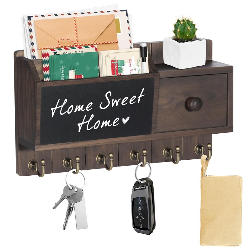 RELBRO Key Holder Wall Mount, Wooden Mail and Key Organizer with Black Board Key Rack with Drawer, Small Shelf, 6 Key Hooks, Brown