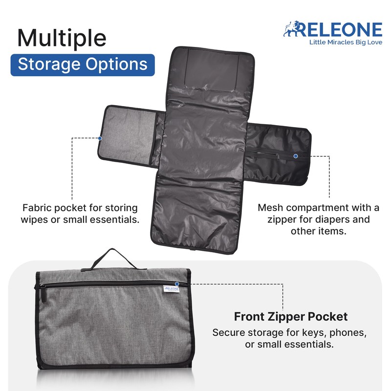 - ๐ ๐๐น๐๐ถ๐ฝ๐น๐ฒ ๐๐๐ผ๐ฟ๐ฎ๐ด๐ฒ ๐ฝ๐ผ๐ฐ๐ธ๐ฒ๐๐: Keep your baby's wipes and diapers close with the convenient pockets, making diaper changes easier for you. The Releone Changing Pad includes a dedicated baby wipes pocket; two mesh storage compartments, and a front zipper pocket for personal items like keys or phones.