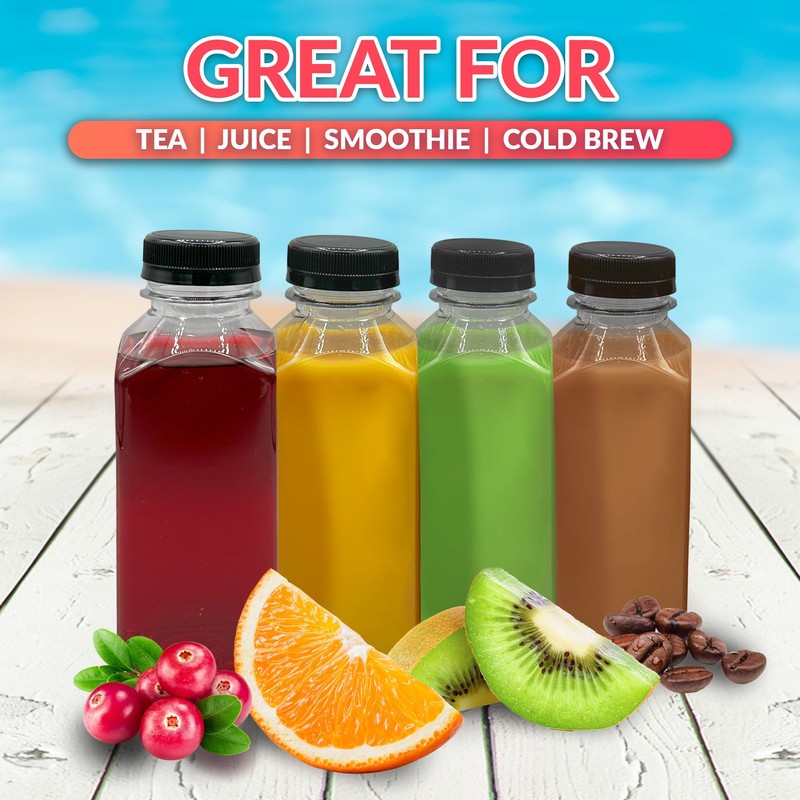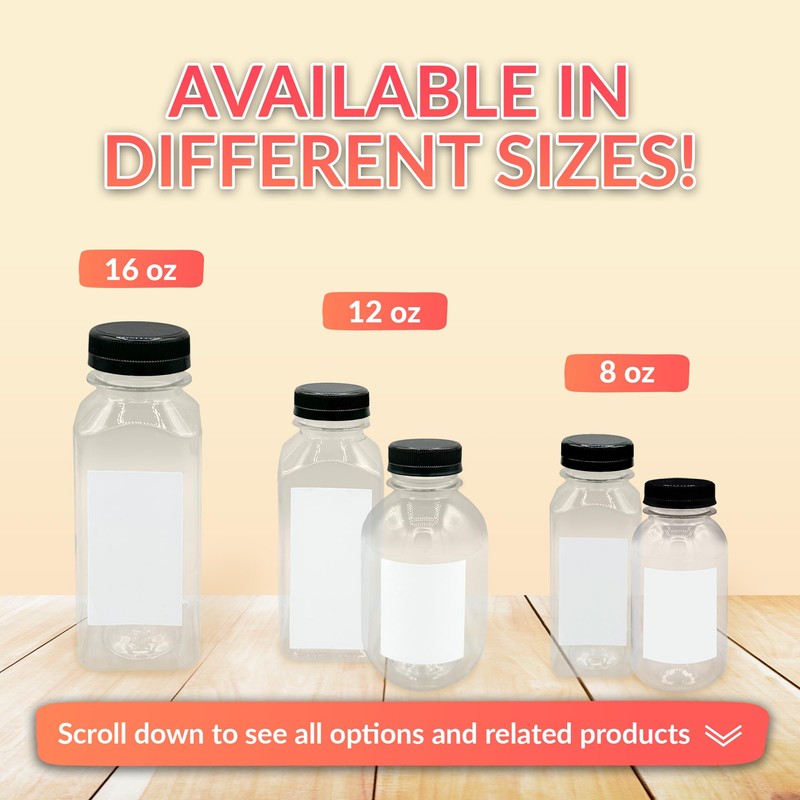 • Plastic Juice Bottles with Caps & Sticker Labels | 24 Pack (24 Bottles & 24 Labels) | 12oz - Square | Ideal for Juicing, Smoothies