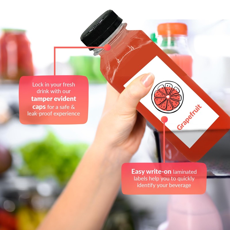 • Freshness Sealed: Each black tamper evident cap provides security to ensure there's no tampering of your drink, remains leak-proof, & locks in your juice or smoothies flavor