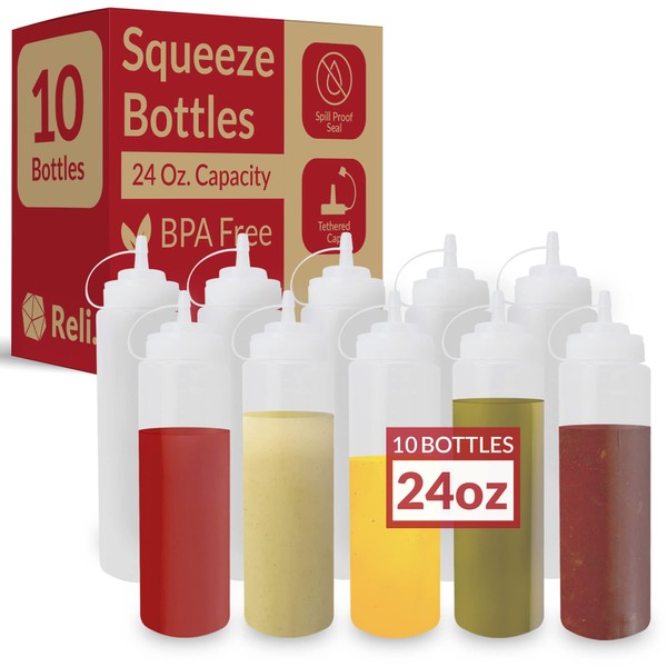 Reli. Plastic Squeeze Bottles, 24 oz. | 10 Pack | Condiment Squeeze Bottles for Sauces | Clear w/Tethered Caps | 24 Ounce Hot Sauce, Ketchup Bottles |Squirt Bottles for Condiments, Olive Oil, Liquids