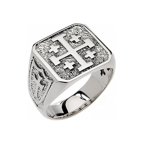 The Jerusalem cross, also known as Crusaders' cross or the "Five-fold Cross", is a heraldic cross or Christian symbol consisting of a large cross potent surrounded by four smaller Greek crosses, one in each quadrant. This fashionable, contemporary all sterling silver Jerusalem Cross ring will make a great addition to any men’s jewelry collection.